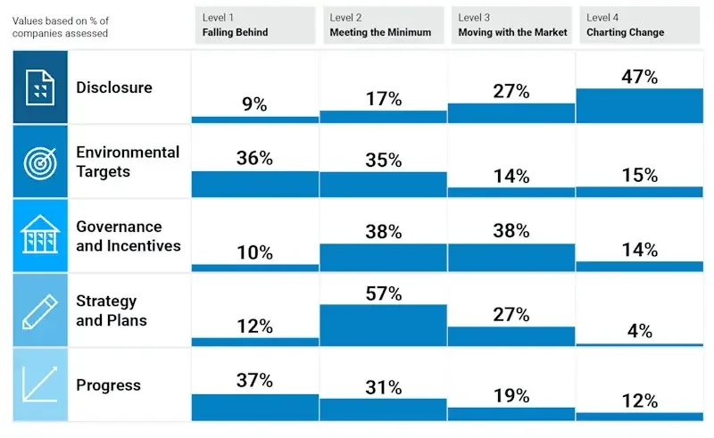 Progress measures the translation of disclosure, targets, governance, and strategy into tangible outcomes. It captures reductions in emissions, improvements in biodiversity management, and other measurable impacts. High-performing companies track implementation over time and adjust course based on data-driven insights.